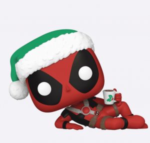 Deadpool makes with a beefcake pose as he sports his green cap and usual red togs making with the Christmas colors.