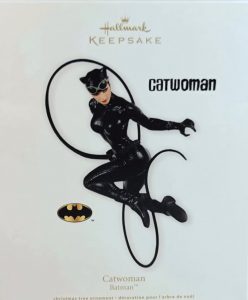 Her brief bio is offered on the back of the 2012 Hallmark box: “Since a troubled childhood left her to fend for herself, Salina Kyle has taken to the streets, adopting the purr-fect guise for a skilled cat burglar. Stalking slyly through the night, the feline felon known a Catwoman leaps through Gotham City with acrobatic grace, robbing from its citizens and playing a dangerously seductive cat-and-mouse game with Batman. And he’d better be on his toes because this kitten’s got claws…and a whip!”